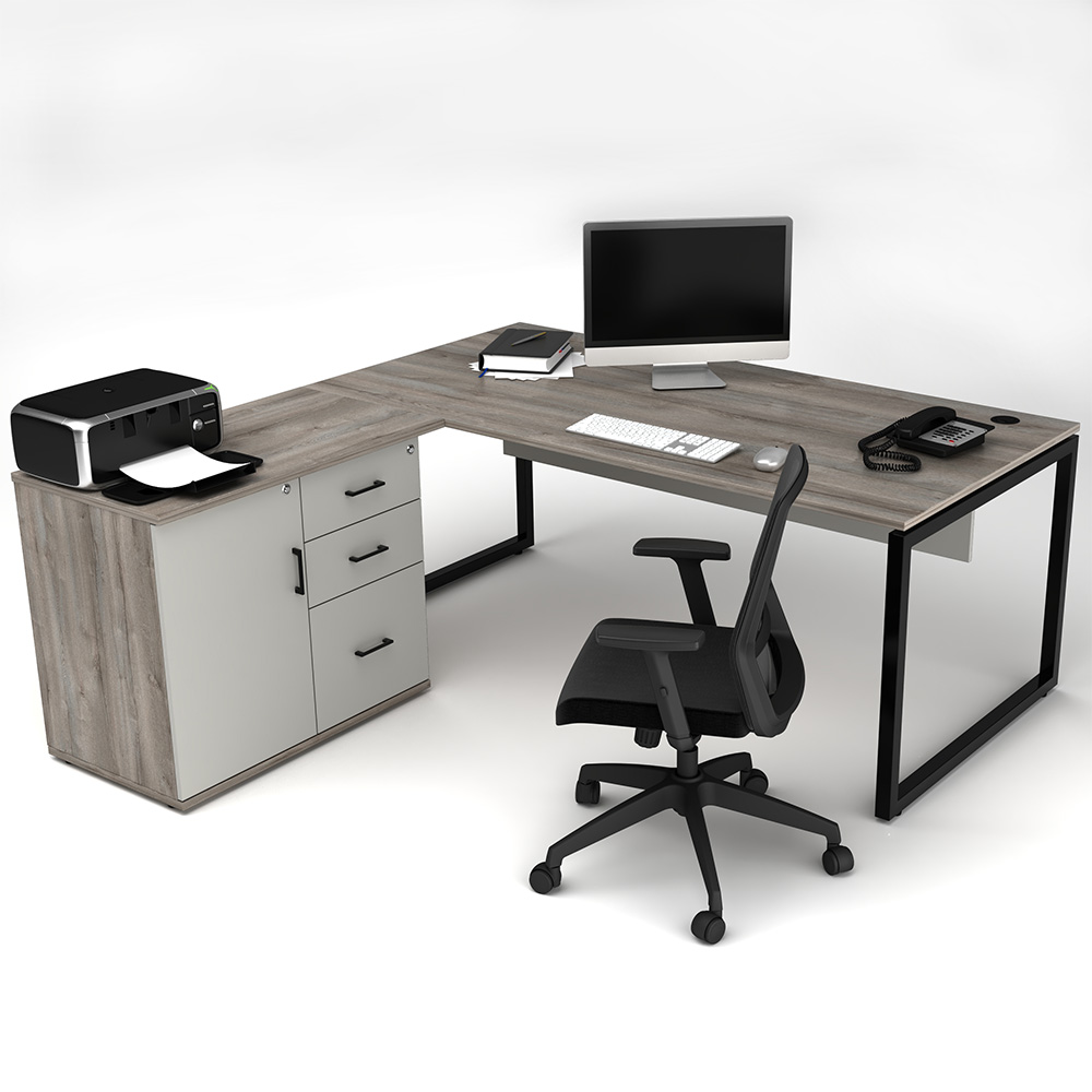 Activity Executive Desk looks great in any office with it modern design with steel loop legs. The lockable side cabinet includes 3 Drawers and a hinged-door cupboard.