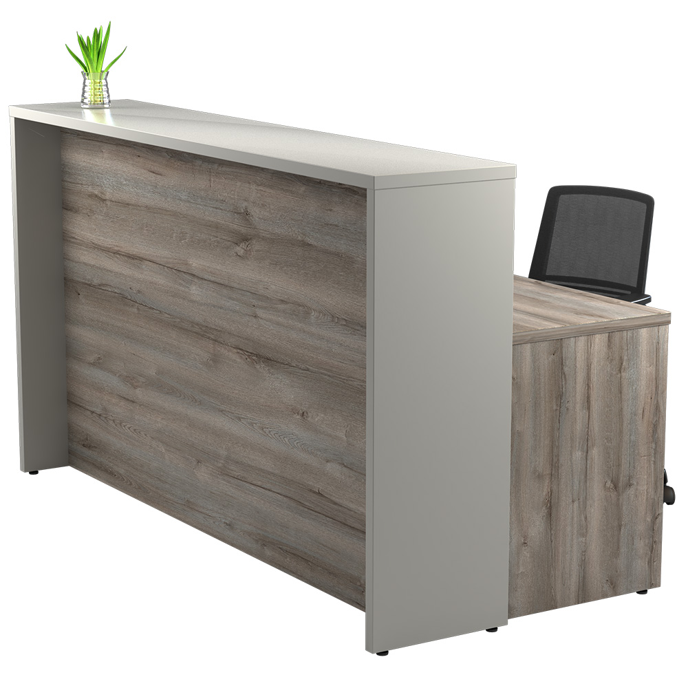 Modern and minimalist, the Activity Straight Reception Desk features a sleek two-tone design that blends woodgrain with solid colours for a contemporary look. Available in Storm Grey & Sahara or Sanctuary & Castle Grey, it adds a stylish touch to any reception area.